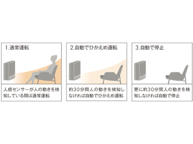 人感センサーが人の動きを検知。人がいなくなると暖房を弱めたり停止させたりすることで、うっかり消し忘れた時の、無駄な運転を抑えます。